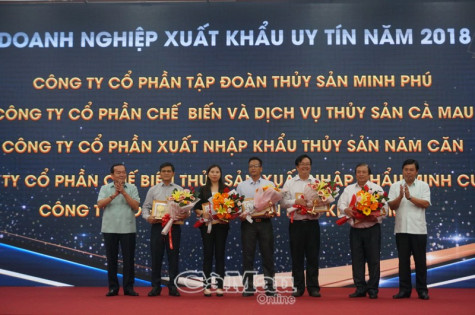 | Phó bí thư thường trực Tỉnh uỷ Phạm Bạch Đằng cùng Chủ tịch UBND tỉnh Cà Mau Nguyễn Tiến Hải trao biểu trưng và hoa chúc mừng các doanh nghiệp, doanh nhân tiêu biểu |