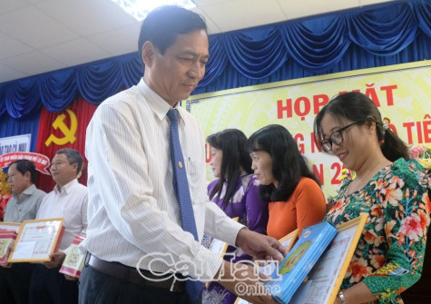 Phó Chủ tịch UBND tỉnh Cà Mau Trần Hồng Quân tặng bằng khen cho nhà giáo tiêu biểu Ảnh: Kim Chi