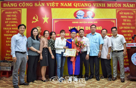 Tuyên dương em Huỳnh Anh Khôi, UBND huyện Đầm Dơi tặng giấy khen kèm 2 triệu đồng; Hội Khuyến học huyện tặng 1 triệu đồng; trường THPT Đầm Dơi khen thưởng 1 triệu đồng. |