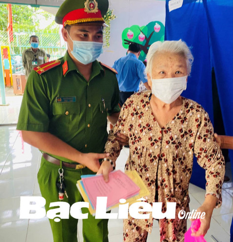 Công an hỗ trợ cụ bà thực hiện quyền bầu cử tại điểm bầu cử số 1 (Phường 1, TX. Giá Rai). Ảnh: K.P