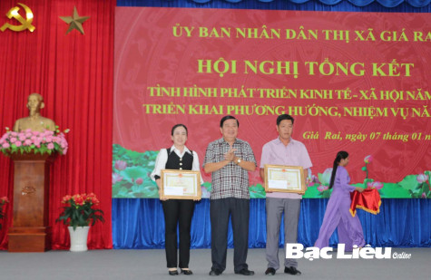 Ông Đỗ Minh Thắng - Chủ tịch UBND TX. Giá Rai tặng giấy khen cho 2 địa phương có thành tích trong công tác vận động người dân tham gia bảo hiểm y tế tự nguyện. Ảnh: K.K