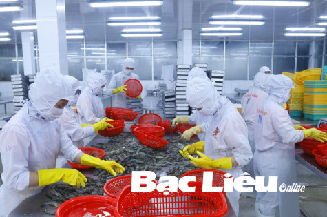 Chế biến tôm nguyên liệu xuất khẩu tại Công ty thủy sản trên địa bàn TX. Giá Rai. Ảnh: H.T