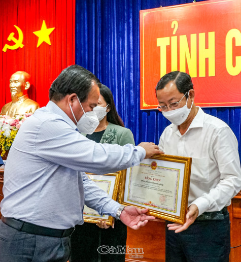 | Phó chủ tịch UBND tỉnh Nguyễn Minh Luân trao tặng Bằng khen của UBND tỉnh cho các tập thể có thành tích xuất sắc năm 2021. |
