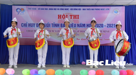 Các Chỉ huy Đội TP. Bạc Liêu thực hiện phần thi kỹ năng trống Đội. Ảnh: Đ.K.C