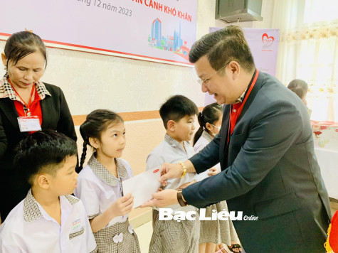Ông Trương Hoàng Giang - Giám đốc Văn phòng Dai-ichi Life Bạc Liêu 2 trao học bổng cho học sinh có hoàn cảnh khó khăn của Trường tiểu học Nguyễn Thị Định.