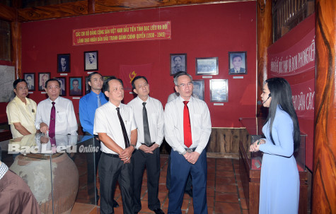 Các đồng chí lãnh đạo tỉnh tham quan, nghe thuyết minh về lịch sử ra đời, quá trình các Chi bộ Đảng đầu tiên của tỉnh lãnh đạo Nhân dân đấu tranh giành chính quyền. Ảnh: H.T