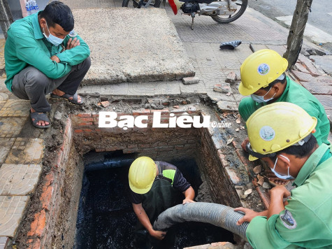 Các công nhân đang tiến hành thông một hố ga trên địa bàn Phường 1 (TP. Bạc Liêu). Ảnh: C.L