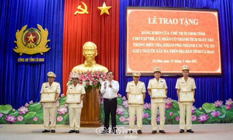 Với thành tích phá nhanh nhiều vụ trọng án và án nghiêm trọng, cuối tháng 5 vừa qua, Chủ tịch UBND tỉnh Cà Mau đã tặng Bằng khen cho 5 tập thể và 9 cá nhân có thành tích xuất sắc, trong đó có nhiều cán bộ, chiến sỹ Phòng Cảnh sát Hình sự (CSHS) Công an tỉnh.