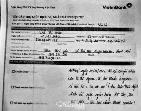 | Giấy xác nhận của ngân hàng về việc chị Gần đã chuyển tiền cho chị Ngoan. |