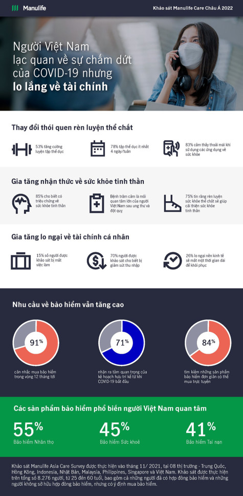 (CMO) Theo khảo sát Manulife Asia Care Survey lần thứ 3 được thực hiện vào tháng 11/2021, hơn 2/3 (69%) cho rằng Covid-19 sẽ biến mất trong vòng một năm tới, với 77% mong đợi các biện pháp hạn chế Covid-19 sẽ dần được dỡ bỏ trong khoảng thời gian này.