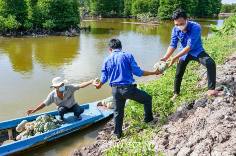 | Ðoàn Thanh niên thị trấn Cái Ðôi Vàm, huyện Phú Tân hỗ trợ gia đình ông Hồng Văn Hài thu hoạch bí; đồng thời kết nối tiêu thụ với giá 17.000 đồng/kg. Ảnh: BĂNG THANH |