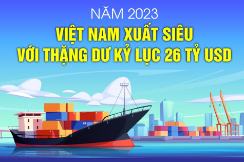 Năm 2023, cán cân thương mại tiếp tục xuất siêu năm thứ 8 liên tiếp với mức thặng dư ước đạt 26 tỷ USD, tăng gần gấp 3 lần năm 2022.