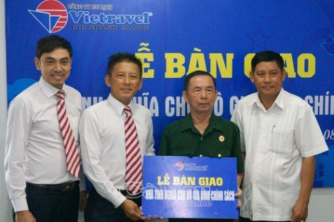 Ông Nguyễn Thanh Hải, Chủ tịch Công đoàn Tổng Công ty Vietravel (thứ hai từ trái sang) trao kinh phí hỗ trợ xây nhà tình nghĩa cho ông Phan Lạc Hồng.