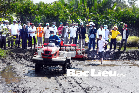 Trình diễn máy sạ lúa theo khóm cho vùng canh tác lúa - tôm ở huyện Hồng Dân.