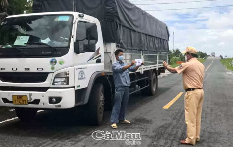 | Lực lượng chốt chặn kiểm tra giấy luồng xanh xe tải vào địa bàn tỉnh qua tuyến đường Hành lang ven biển phía Nam. |
