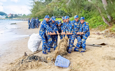 Các quân nhân thu gom rác thải tại khu vực bờ biển Đặc khu Phú Quốc.