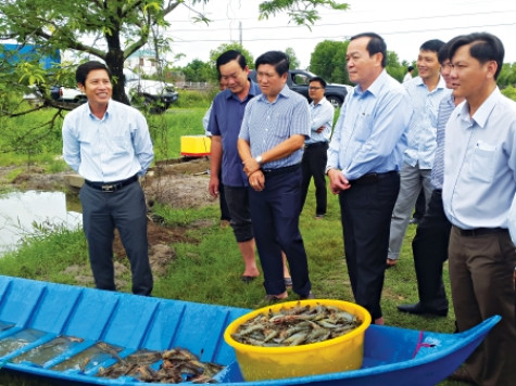 | Phó Bí thư Thường trực Tỉnh uỷ Cà Mau Phạm Bạch Ðằng và Phó Chủ tịch UBND tỉnh Cà Mau Lê Văn Sử (thứ hai, ba hàng đầu, phải sang) kiểm tra mô hình nuôi tôm quảng canh cải tiến tại huyện Phú Tân. Ảnh: QUỐC NGỮ |