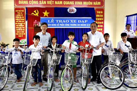 | Bí thư Huyện uỷ Cái Nước Dương Văn Thắng (áo trắng) trao xe đạp tiếp sức đến trường cho học sinh nghèo ở xã Đông Hưng. Ảnh: Thanh Nhàn |