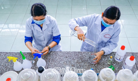 Chi đoàn giáo viên Trường Cao đẳng cộng đồng Cà Mau tích cực pha chế nước rửa tay để phục vụ kỳ thi tốt nghiệp THPT 2021. |