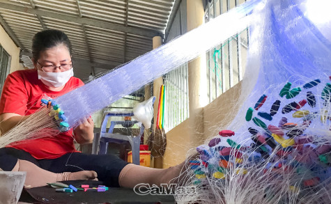 | Tuy thu nhập từ nuôi tôm, cua khá cao, mỗi năm trên 100 triệu đồng nhưng chị Lê Thị Út vẫn làm thêm nghề gia công lưới và buôn bán nhỏ để tăng thu nhập. |
