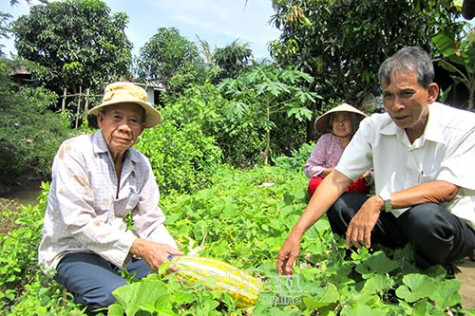 | Tận dụng đất vườn trồng rau màu giúp gia đình ông Ngô Minh Quang (bìa trái) tăng thu nhập. |