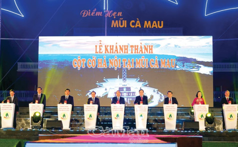 | Thủ tướng Chính phủ Nguyễn Xuân Phúc (giữa), lãnh đạo các bộ, ngành Trung ương và lãnh đạo tỉnh Cà Mau thực hiện nghi thức khánh thành Cột cờ Hà Nội tại Mũi Cà Mau. Ảnh: K.PHƯƠNG |