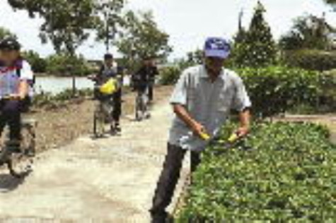 | Ông Nguyễn Văn Giếng, ấp Tân Điền A, xã Thanh Tùng cắt tỉa hàng rào cây xanh. |