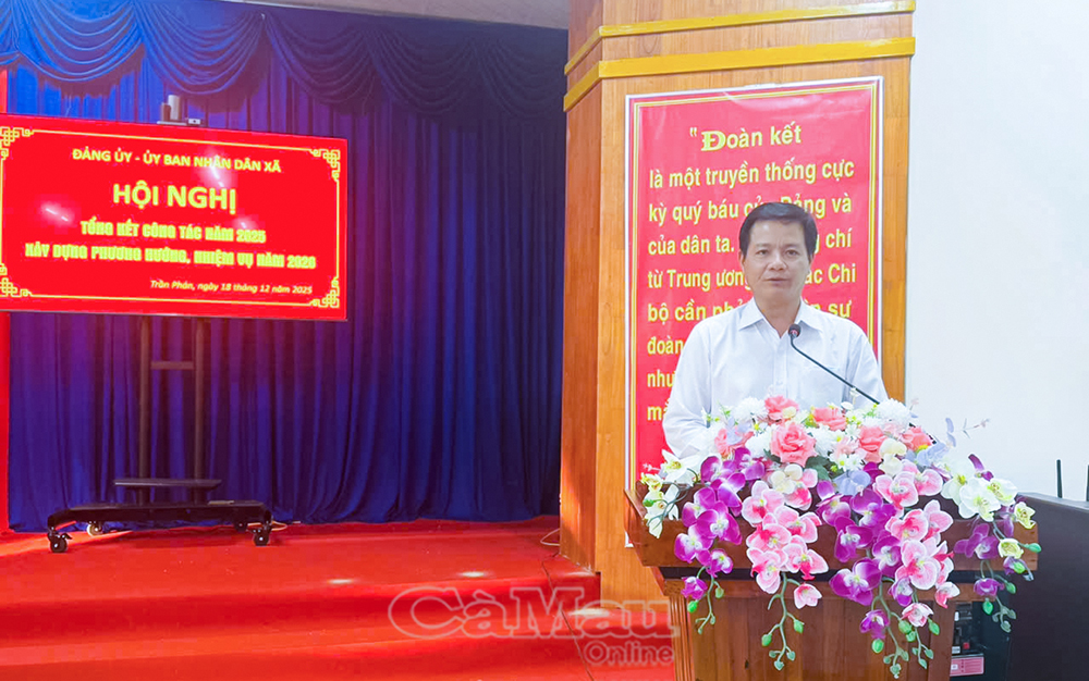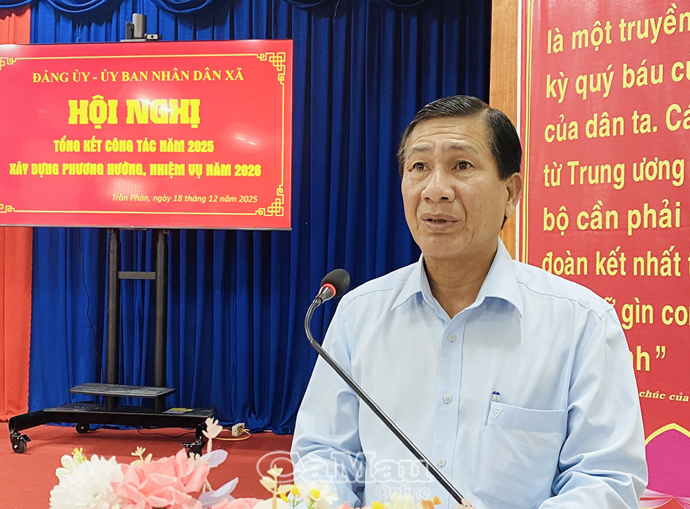 Báo Cà Mau Chiều 18/12, Đảng uỷ - UBND xã Trần Phán tổ chức hội nghị tổng kết công tác lãnh đạo, chỉ đạo phát triển kinh tế - xã hội và xây dựng hệ thống chính trị năm 2025, đồng thời đề ra phương hướng, nhiệm vụ trọng tâm năm 2026. Dự hội nghị có đồng chí Phạm Thanh Chờ, Phó Chủ nhiệm Uỷ ban Kiểm tra Tỉnh uỷ Cà Mau.