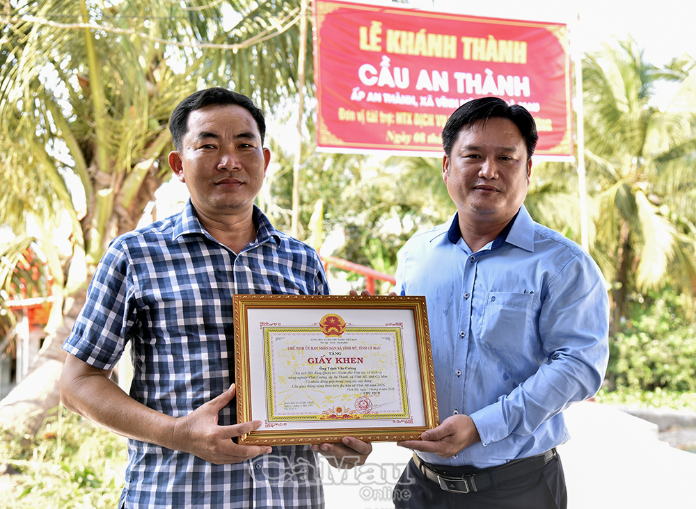 Chủ tịch UBND xã Vĩnh Mỹ Trần Minh Thới (bên phải) tặng giấy khen tri ân ông Trịnh Văn Cường, Chủ tịch Hội đồng quản trị, Giám đốc Hợp tác xã Dịch vụ nông nghiệp Vĩnh Cường đã tài trợ xây dựng cầu An Thành.