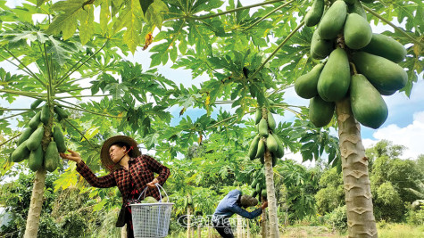 | Vợ chồng chị Bùi Mộng Cầm và anh Nguyễn Văn Phương (Ấp 14, xã Nguyễn Phích) thu hoạch đu đủ trên bờ ruộng, thu nhập thêm 30-40 triệu đồng/năm. |