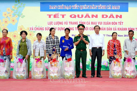 | Đại tá Nguyễn Thanh Phong, Chính uỷ Bộ CHQS tỉnh trao tặng quà cho gia đình chính sách, hộ nghèo trong “Tết quân - dân”. |