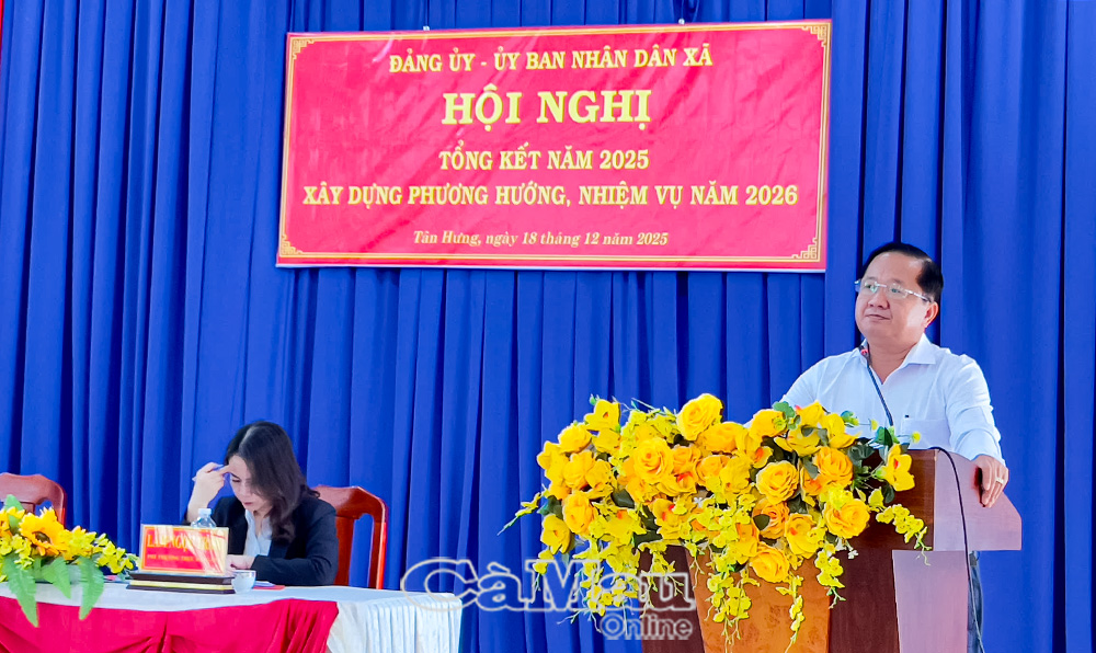 Phát biểu tại hội nghị, đồng chí Lê Thanh Triều, Phó Chủ tịch Thường trực Uỷ ban MTTQ Việt Nam tỉnh Cà Mau biểu dương những kết quả Đảng bộ, chính quyền, MTTQ, các đoàn thể và Nhân dân xã Tân Hưng đạt được trong năm 2025. Đồng chí đề nghị toàn hệ thống chính trị xã đổi mới tư duy, nâng cao trách nhiệm, đặc biệt là đội ngũ cán bộ, công chức, viên chức; khắc phục triệt để biểu hiện “chờ chỉ đạo”, sợ trách nhiệm; chuyển từ tư duy hành chính sang đột phá, đổi mới sáng tạo, dám nghĩ, dám làm, dám chịu trách nhiệm vì lợi ích chung.