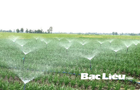 Vùng sản xuất rau sạch tưới phun tự động ở huyện Vĩnh Lợi. Ảnh: K.T