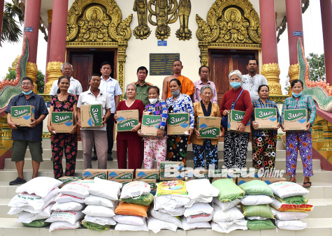 Công an TP. Bạc Liêu tặng quà cho đồng bào phật tử chùa Trà Kha (Phường 8) nhân dịp tết Chôl-chnăm-thmây 2022. Ảnh: T.Đ