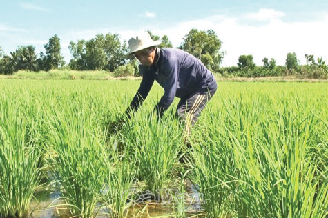 | Nông dân Ấp 6, xã Tân Lộc Bắc đang kiểm tra sự sinh trưởng và phát triển của cây lúa. |