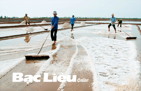 Các thành viên HTX Diêm Điền (huyện Đông Hải) thu hoạch muối. Ảnh: L.D