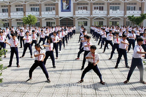 Vào giờ ra chơi, thay vì tập thể dục, học sinh Trường THCS Nguyễn Thị Minh Khai (Phường 9, TP Cà Mau) được học 36 thế võ cổ truyền. |