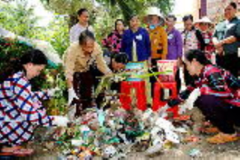 | Chị em phụ nữ ấp Bùng Binh 1, xã Hoà Tân được hướng dẫn phân loại rác thải để tái sử dụng. |