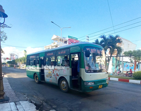 Xe buýt mở cửa khi lưu thông trên đường Trần Phú (TP. Bạc Liêu) - ảnh chụp sáng 24/4/2023.