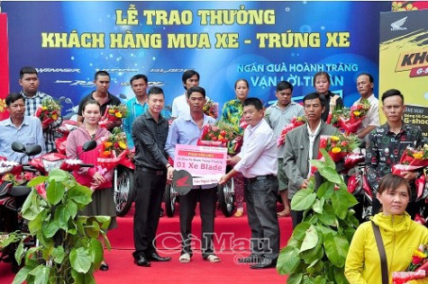 (CMO) Chiều 21/3, Hệ thống Ôtô, xe máy Ngọc Anh tổ chức trao thưởng mua xe trúng xe trong chương trình “ngàn quà hoành tráng - vạn lời tri ân”. Chương trình khuyến mãi này được áp dụng cho khách hàng mua xe tại hệ thống Cửa hàng xe máy Tân Ngọc Anh ra từ ngày 1/2/2018-4/2/2019. Cửa hàng đã chọn ngẫu nhiên và trao thưởng 22 khách hàng may mắn.