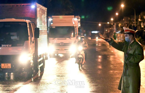 Cảnh sát giao thông chốt chặn, hướng dẫn phương tiện nhập tỉnh vào khu vực kiểm soát tại chốt Quốc lộ 1A, TP Cà Mau.