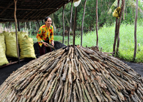 | Bà Trương Thị Điểu có nguồn thu chính từ việc mót đọt cây keo lai, nhánh tràm để hầm than. |