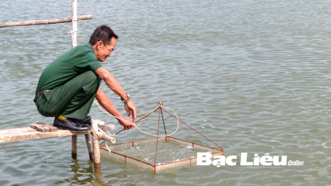 Cựu chiến binh Lê Trung Kiệt kiểm tra tôm nuôi. Ảnh: C.L