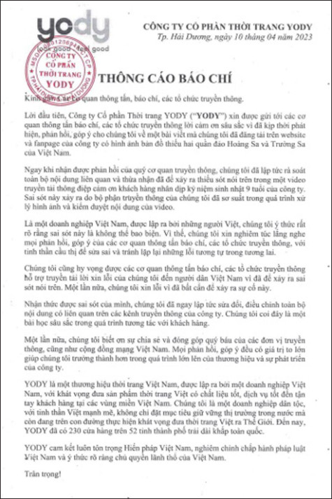 Thông cáo báo chí và lời xin lỗi của Công ty Cổ phần thời trang Yody sau sự việc.