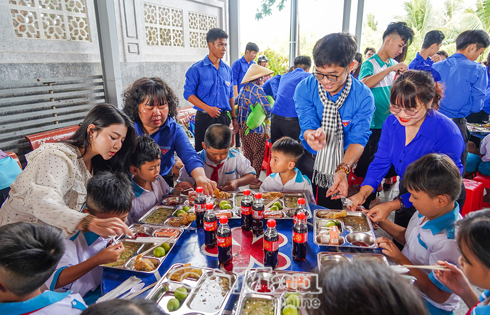 Đoàn viên, thanh niên chuẩn bị và chăm chút từng bữa ăn cho các em nhỏ.