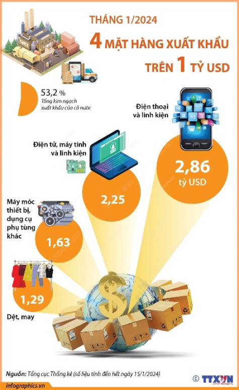 Kim ngạch xuất khẩu hàng hóa tháng 1/2024 ước đạt 33,57 tỷ USD, tăng 42% so với cùng kỳ năm trước.