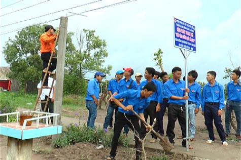 | Lực lượng đoàn viên, thanh niên tham gia xây dựng công trình thắp sáng đường quê ở ấp Bà Hính, xã Quách Phẩm. |