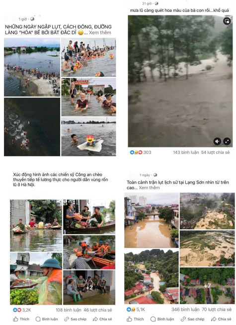 Những ngày qua, mạng xã hội xuất hiện nhiều clip, hình ảnh, thông tin về trận lũ lụt tại các tỉnh phía Bắc. Đó là cảnh thôn làng, thành phố chìm trong nước; người dân phải vật lộn với lũ lụt bủa vây; nghĩa cử đẹp của các tổ chức, đơn vị khi không quản ngại khó khăn, vất vả đi tiếp tế lương thực cho người dân vùng rốn lũ…